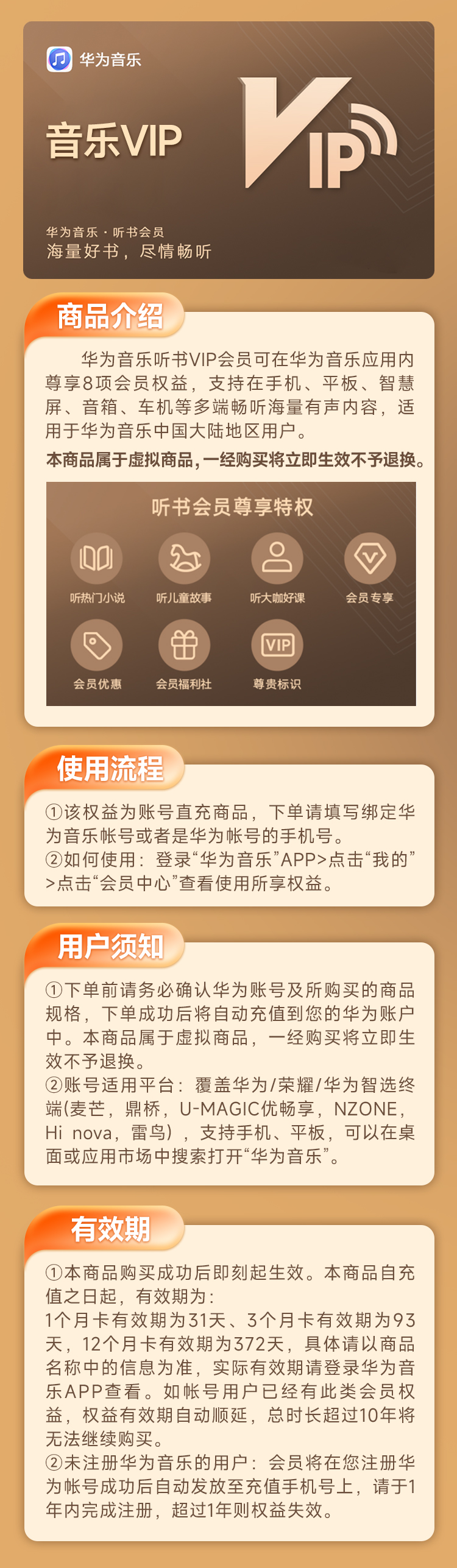 【自动充值】华为音乐听书会员12个月丨不支持鸿蒙系统
